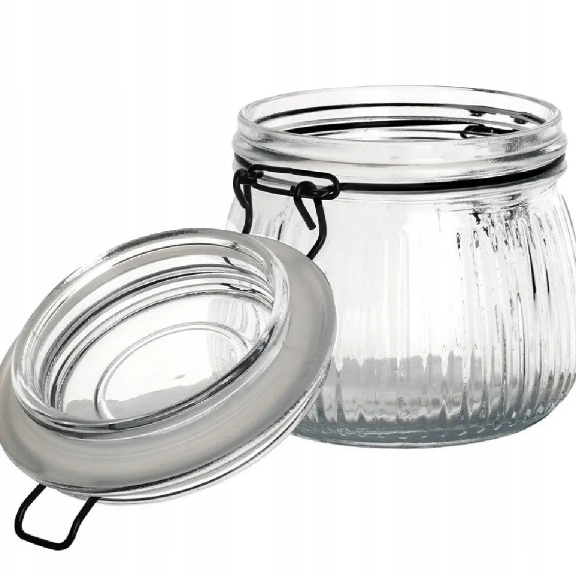 De glazen opslagpot heeft glas dat bewerkt is met strepen. Verder heeft de weckpot een inhoud van 500 mililiter.